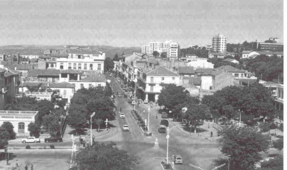 Perspective sur le début de l'avenue Georges Clémenceau. A droite le bâtiment blanc du mess des officiers et son parc. A gauche, le lycée Eugène Albertini. Au loin se dressent le nouveau quartier de la pinède. Au sommet de la colline, le moderne hôpital civil. Le regroupement des manifestants venant du sud et du nord s'est effectué sur le rond-point central pour s'engager dans l'avenue Georges Clémenceau.