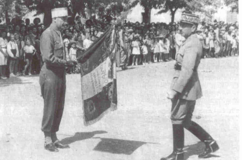 Fin mai à Sétif, le Général Duval salue l'étendard du 7ème RTA de retour de sa glorieuse épopée.