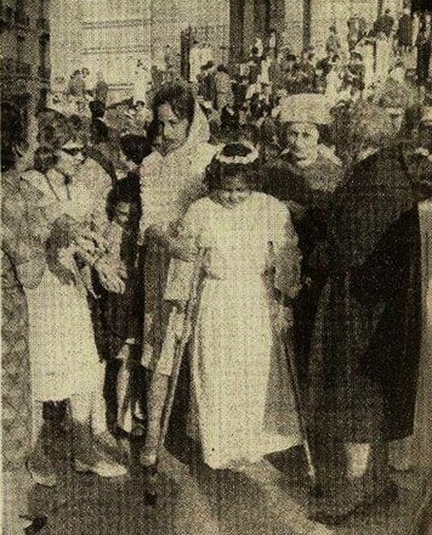 Celle d'une gamine, Frédérique Dubiton, 13 ans, en communiante... et avec des béquilles. Amputée d'une jambe.