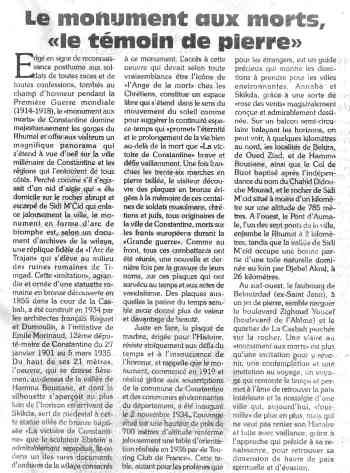 Toutefois, je trouve votre message et votre initiative très touchants, allant dans le sens d'une paix et d'une sauvegarde d'un patrimoine construit par les Pieds-Noirs. Votre démarche devrait être comprise par tous les Algériens dans le sens où les démolitions ou destructions de monuments et de cimetières ne servent pas leur cause et ne fera pas disparaître notre mémoire ni aucune autre mémoire. Toute mémoire doit être sauvegardée pour en tirer les leçons de l'histoire et pour l'oeuvre de la paix.
